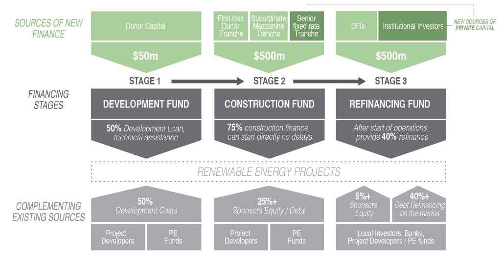 A Re-financing Fund would have right of first refusal on up to 50% of the long-term refinanced debt of derisked projects after they enter commercial operation. The price for re-financing would be set by the other 50% of external investors and local banks. The Refinancing Facility would consist of investors seeking long-term de-risked infrastructure debt, and in this way, attract a new tranche of investors to clean energy in developing countries.