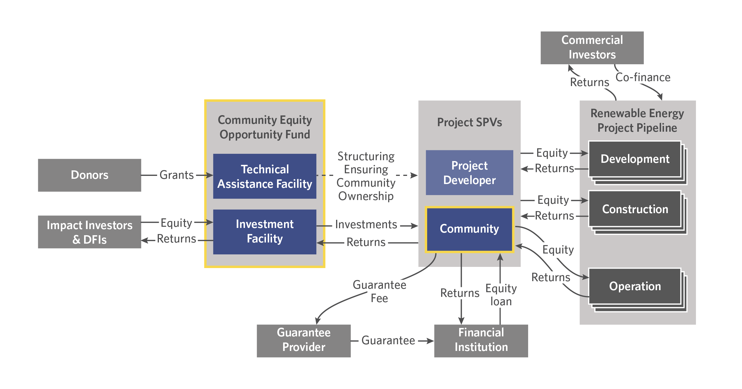 CEOF is designed to embed community ownership in renewable energy projects by financing the special purpose vehicles (SPVs) that hold equity stakes. During the development stage, CEOF provides milestone-based loans covering a substantial share of costs, while commercial partners and communities contribute the rest, securing proportional equity in the SPV. At financial close, these loans are refinanced through construction financing, with CEOF also providing catalytic equity alongside external investors. To safeguard long-term ownership, CEOF enables communities to complete a leveraged buyout of its equity stake a few years post-COD, supported by external credit guarantees that make capital affordable. This design mirrors conventional project finance structures while embedding a co-ownership mechanism that aligns incentives across developers, investors, and communities.