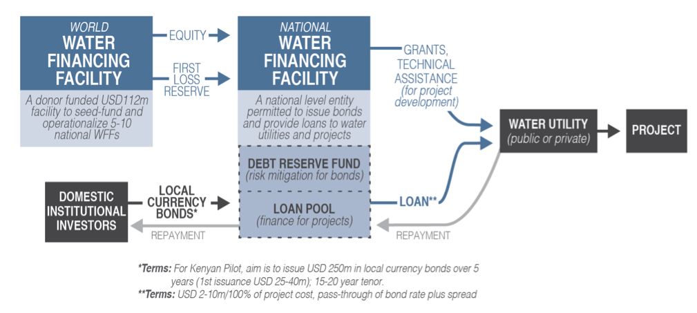 The National WFF would then leverage its blended finance capital structure to issue local currency, investment-grade bonds to domestic institutional investors (such as pension funds and insurance companies). Incomes generated by water utilities would be ring-fenced to provide additional creditworthiness beyond the strength of utilities own balance sheet. National governments may also provide a revenue pledge to the facilities’ debt reserve fund to mitigate credit risk.